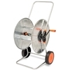 Carrello avvolgitubo con ruote in plastica, adatto a medie superfici; rullo e telaio in acciaio zincato per tubo 100 m da 1/2" e 80 mt da 3/4"