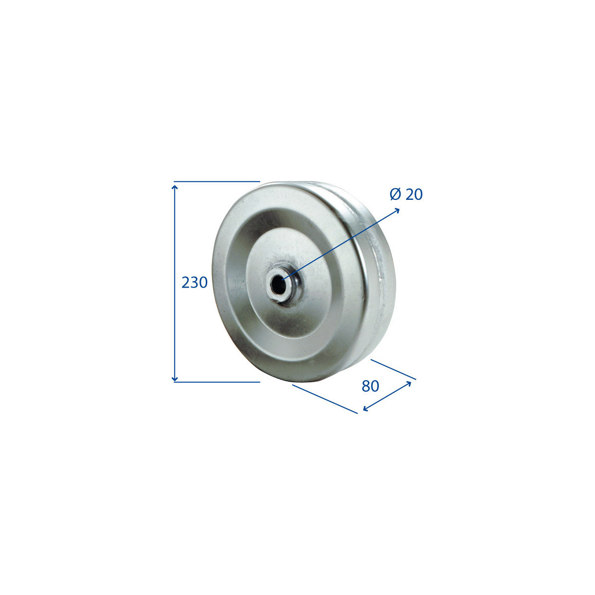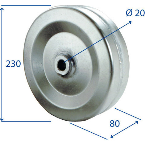 Ruota lamiera 225X80 mm con boccola in nylon autolubrificante